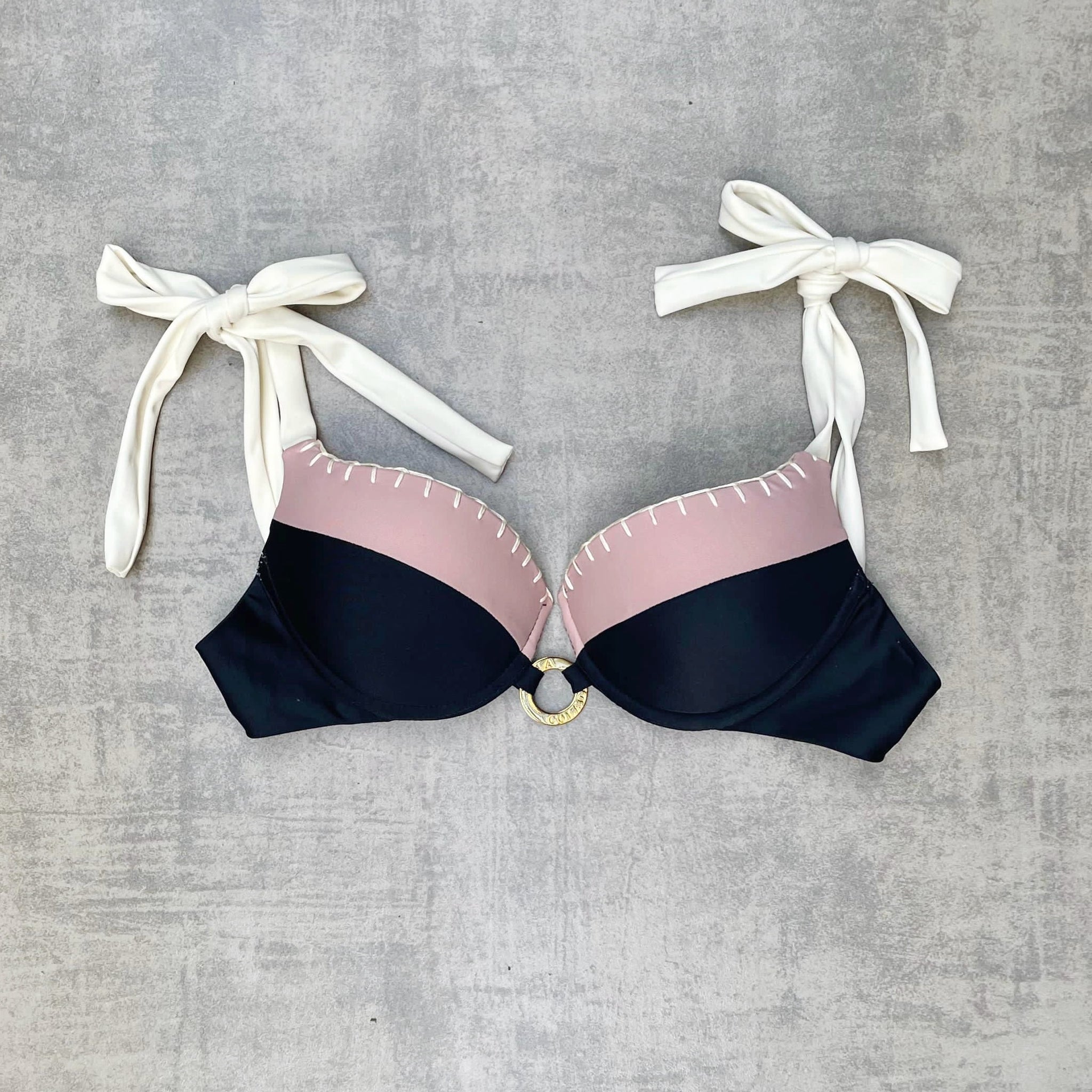 Top con copas push Up y barbas , lleva aro en baño de oro en escote en detalles bordados a mano, tiras gruesas en hombros lo hacen super cómodo ( si tu talla de bra esta entre 2 tallas te recomendamos la mas grande al tener push up el fit es un poco mas pequeño)